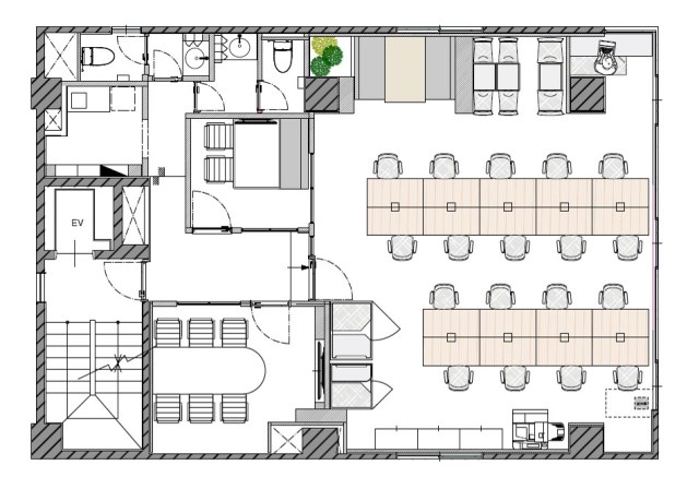 ★内装は2階・4階に会議室2室、テレカンブース、ラウンジスペース、執務室に什器を設置予定である。
