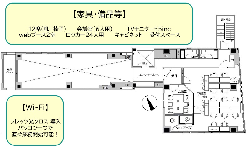 ★ 家具付きセットアップ(机・椅子・ロッカー・受付・6名会議室・WEBブース完備)