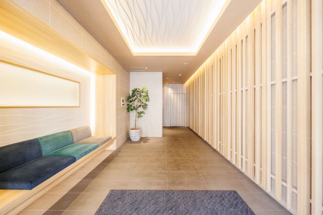 ★ロビーは木目調の格子と間接照明、待合椅子が設置されている